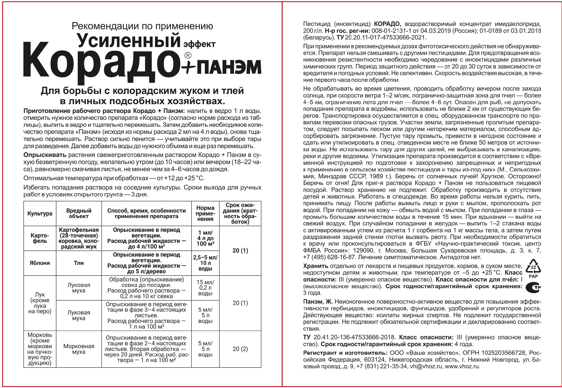 Опрыскивать растения свежеприготовленным раствором Корадо + Панэм в сухую, безветренную погоду, желательно утром (до 10 часов) или вечером (18–22 часа), равномерно смачивая листья, не менее чем за 4–6 часов до дождя. Оптимальная температура при обработках: от +12 до +25 °С. Избегать попадания раствора на соседние культуры.