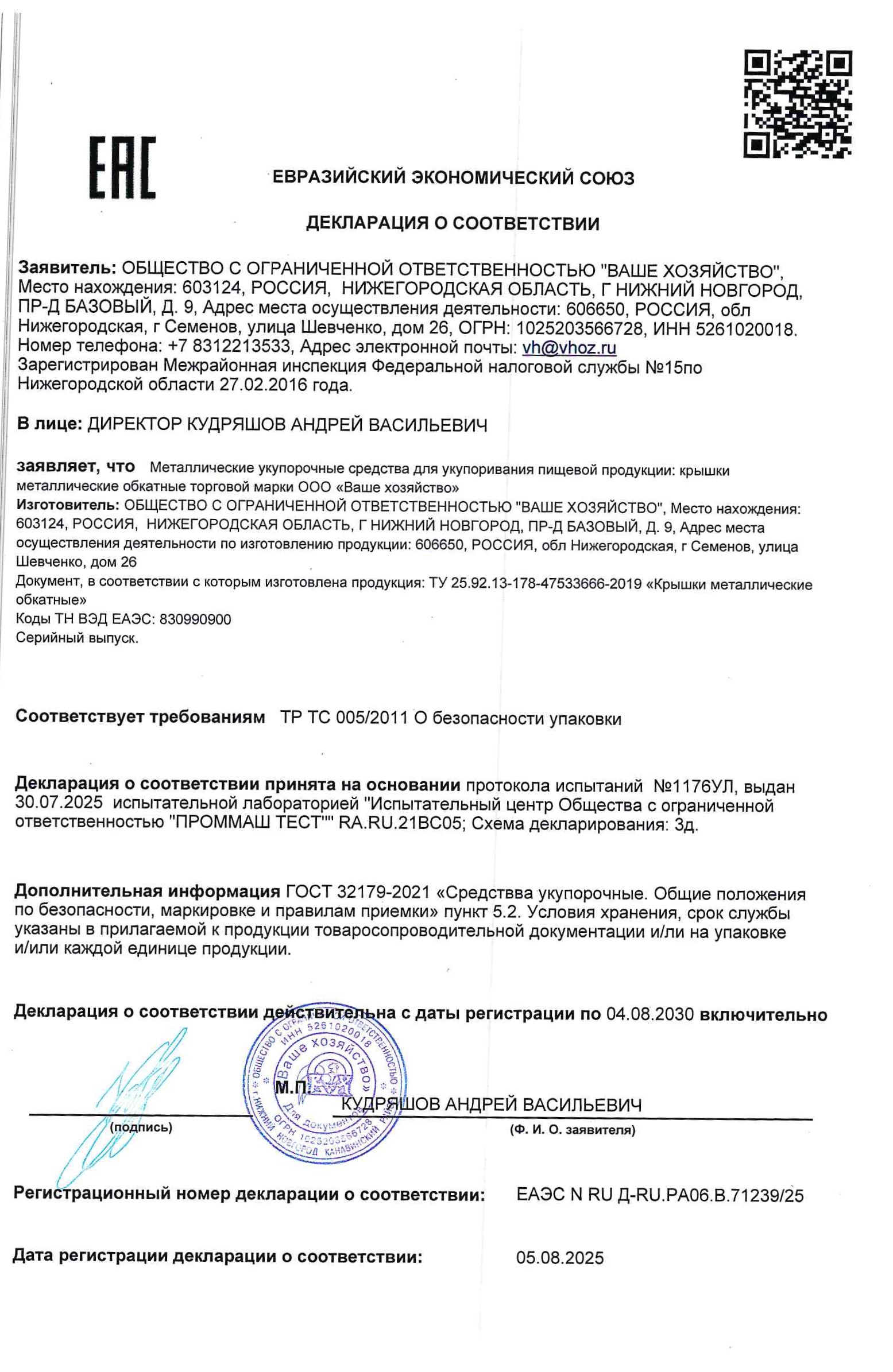 Адрес производства: ООО «Ваше хозяйство», Российская Федерация, 606650, Нижегородская область, г. Семенов, ул. Шевченко, д. 26.