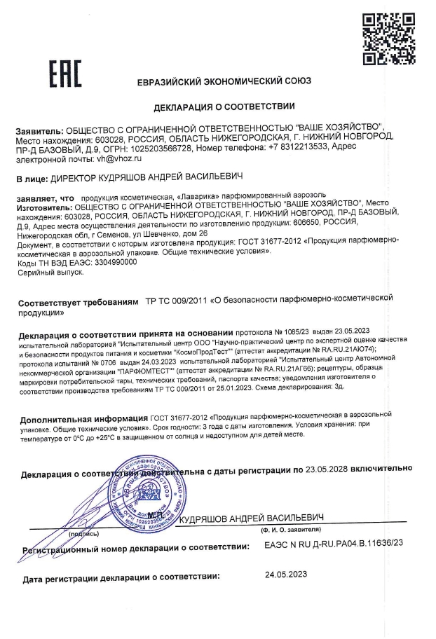 Изготовитель: ООО «Ваше хозяйство», Российская Федерация, 603124, г. Нижний Новгород, ул. Базовый проезд, д. 9, +7 (831) 221-35-34, e-mail: vh@vhoz.ru, www.vhoz.ru.