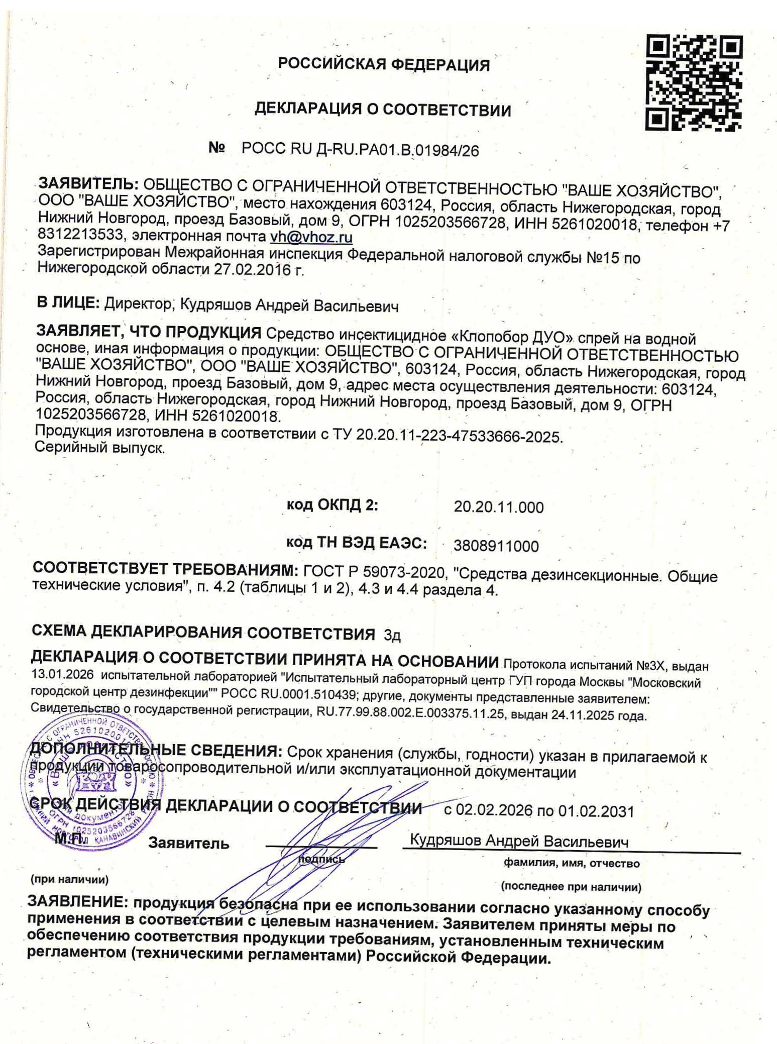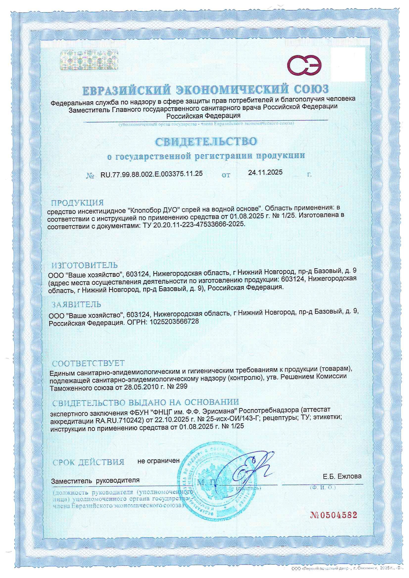Регистрант и изготовитель: ООО «Ваше хозяйство», ОГРН 1025203566728, Российская Федерация, 603124, Нижегородская область, г. Нижний Новгород, ул. Базовый проезд, д. 9, +7 (831) 221-35-34.