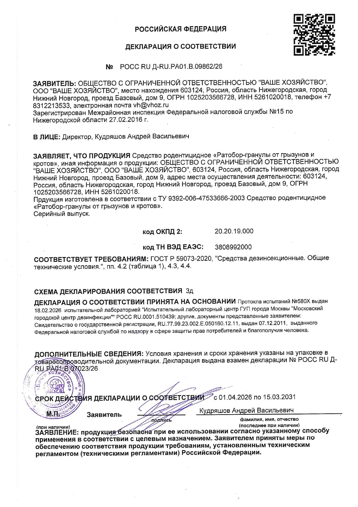 Изготовитель: ООО «Ваше хозяйство», ОГРН 1025203566728, Российская Федерация, 603124, Нижегородская область, г. Нижний Новгород, ул. Базовый проезд, д. 9, +7 (831) 221-35-34, vh@vhoz.ги.