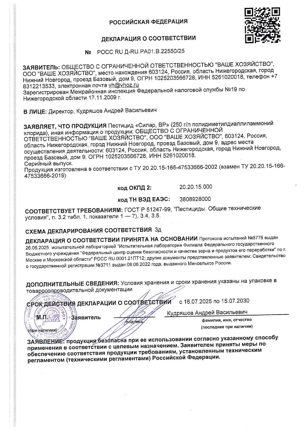 Изготовитель и регистрант: ООО «Ваше хозяйство», ОГРН 1025203566728, Российская Федерация, 603124, Нижегородская область, город Нижний Новгород, ул. Базовый проезд, 9, +7 (831) 221-35-34.