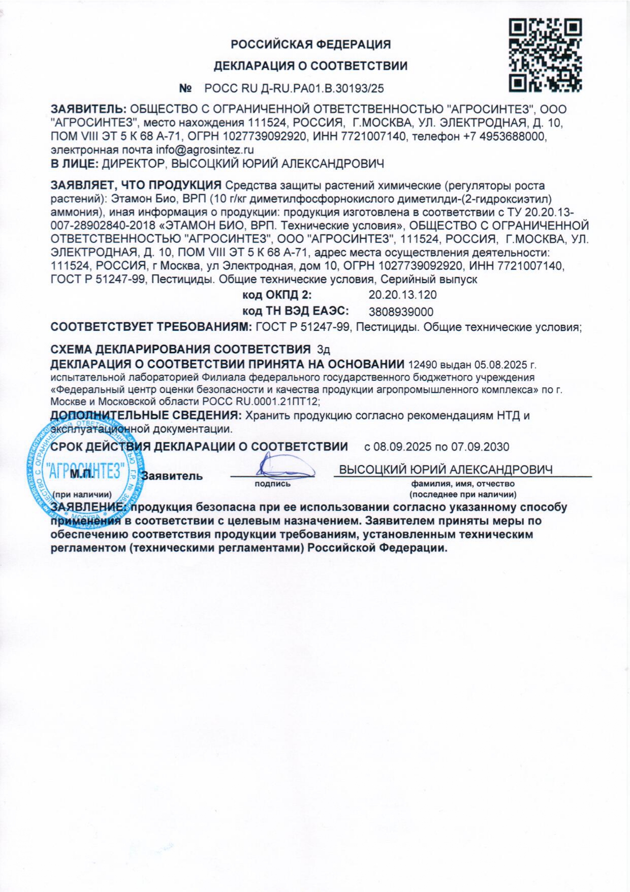 Регистрант и изготовитель: ООО «Агросинтез»‚ адрес местонахождения: 111524, г. Москва, ул. Электродная, дом №10, пом. VIII, эт. 5, к. 68, А-71,+7 (495) 368-80-00. Адрес производственной площадки: 111524, г. Москва, ул. Электродная, д. 10.