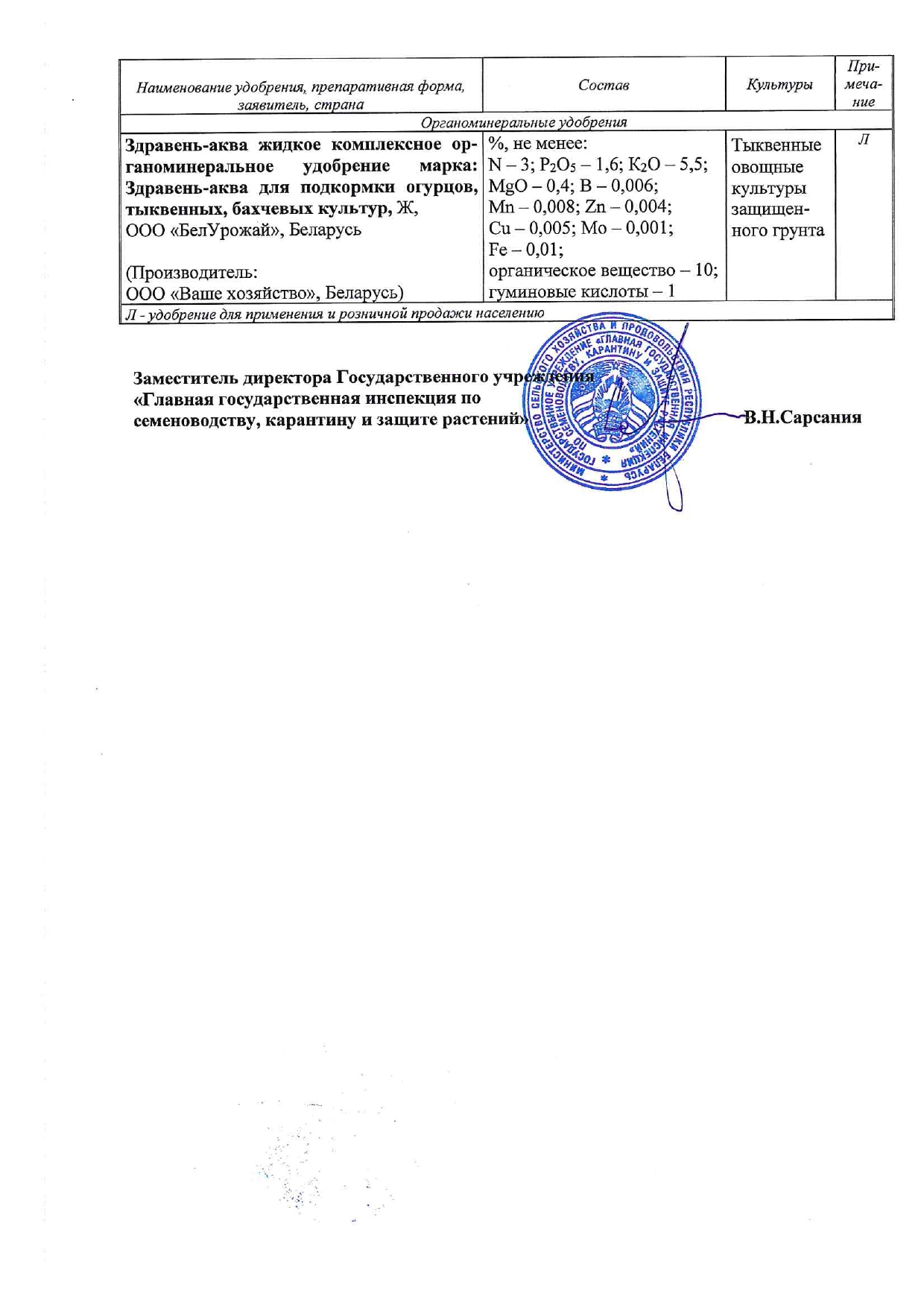 «ЗДРАВЕНЬ АКВА» — жидкое комплексное органоминеральное удобрение для корневых и внекорневых подкормок огурцов, тыквенных и бахчевых культур в личных подсобных хозяйствах.- Содержит оптимальный для подкормки огурцов, тыквенных, бахчевых культур набор макро- и микроэлементов. Не содержит хлора.